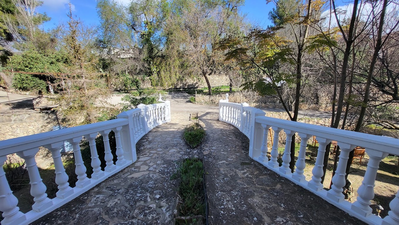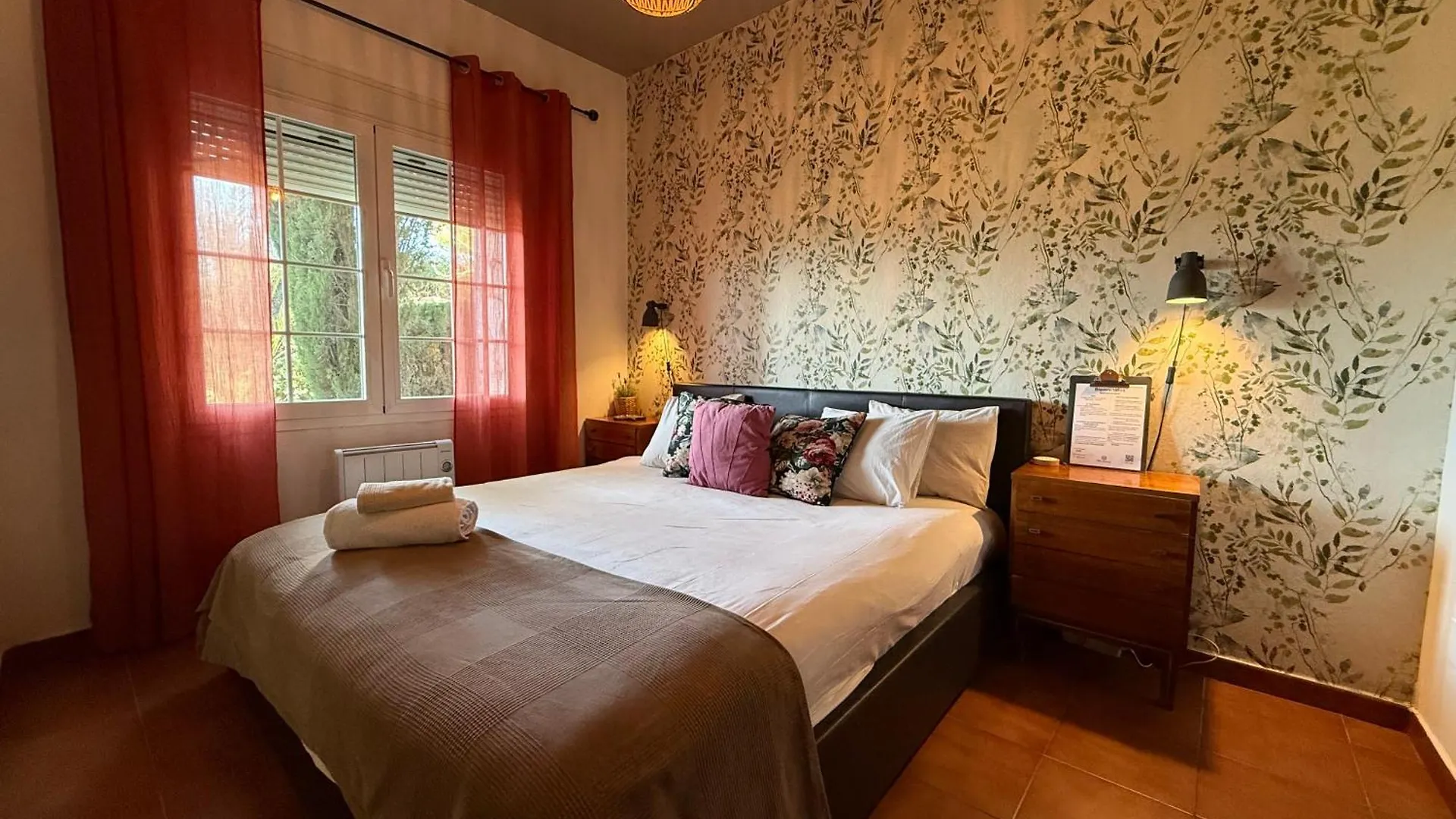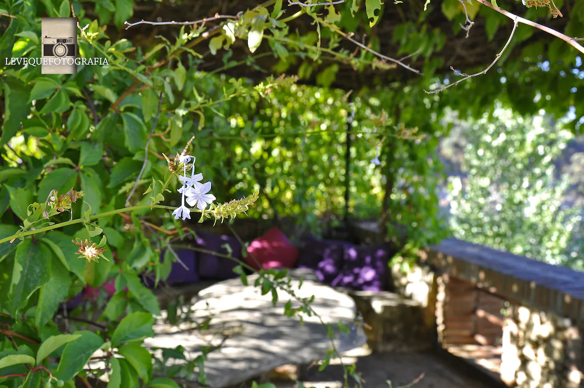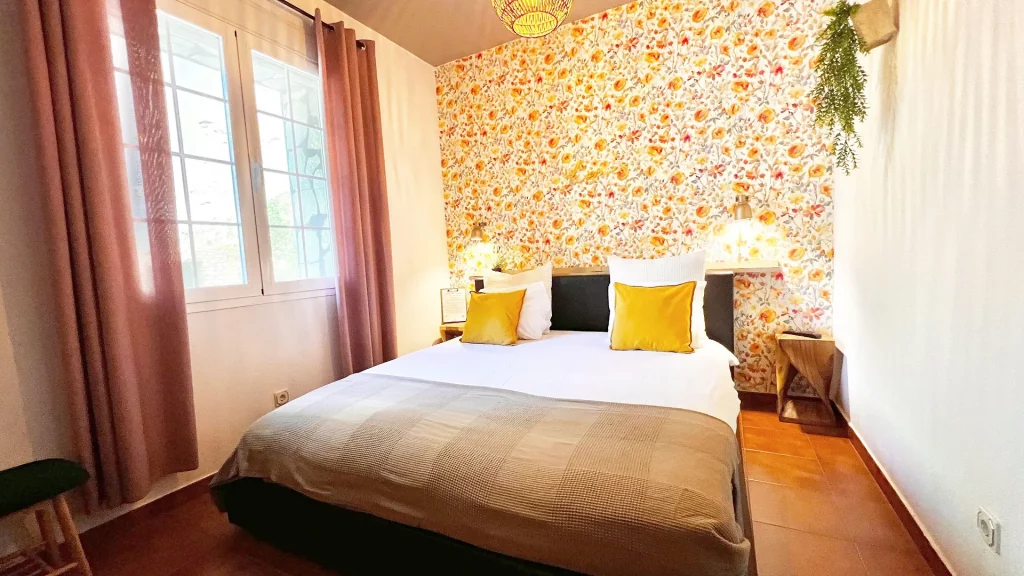 Las llaves de jardín despiertan entre verde. Las ventanas enmarcan los árboles de la finca: higueras, olivos, plantas aromáticas. La sombra natural regula la temperatura y la paz del jardín entra en la habitación sin pedir permiso.